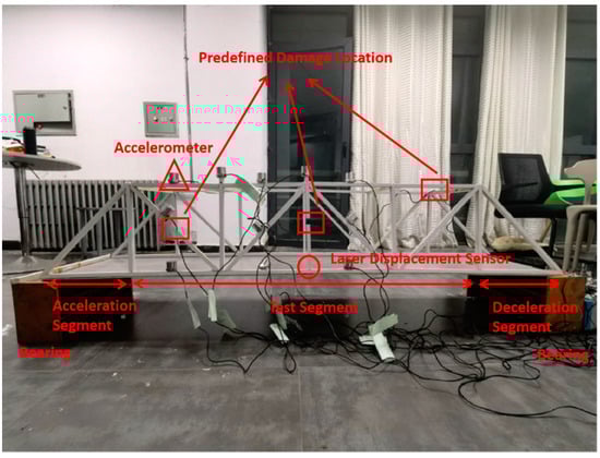 The bridge structure damage identification test system consists of vehicle test models and bridge test models. The bridge test model is divided into an acceleration runway, a bridge test segment, and a deceleration runway. During the experiment, the vehicle can be controlled remotely to accelerate, decelerate, maintain a constant speed, and apply brakes. The vehicle accelerates from rest to the set speed in the acceleration runway, travels at a constant speed through the bridge test segment, and then brakes to a stop in the deceleration runway. The test system based on the bridge test model for bridge structure damage identification is depicted in