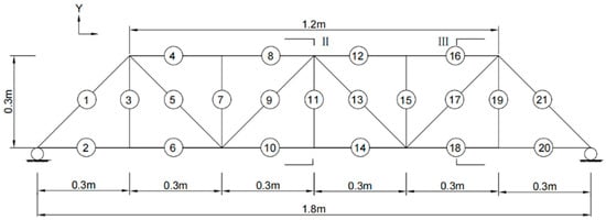 Therefore, in this study, a wooden truss benchmark structure was chosen as the bridge test model. The structural dimensions are as follows: 1.8 m × 0.4 m × 0.3 m, with a main truss spacing of 0.3 m and a bay length of 0.3 m. The truss bridge has a span (L) of 1.8 m, a height (H) of 0.3 m, and a cross-sectional area of 100 mm