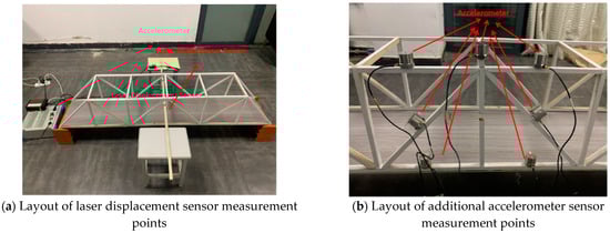 Z-axis) accelerations need to be considered. Consequently, it is sufficient to deploy acceleration and displacement sensors in the vertical direction. To initially locate damage in the bridge structure, displacement sensing is required, necessitating the placement of a displacement sensor at the midspan of the bridge structure. After the preliminary damage localization, additional acceleration sensors are introduced to achieve precise localization of structural damage and identify the spatial damage locations. The arrangement of acceleration and displacement sensors is illustrated in