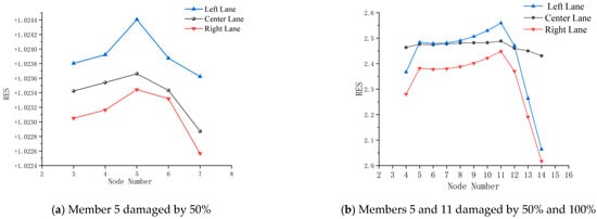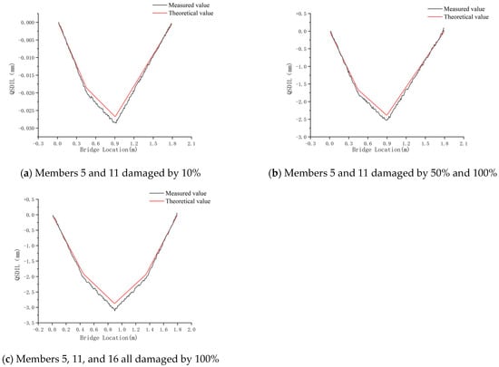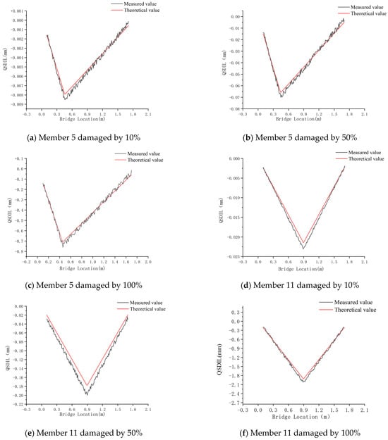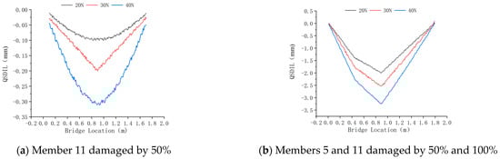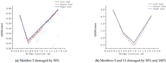 Based on the measurement results from step (4), the displacement influence lines under the assumed damage condition should be subtracted from the displacement influence lines under the undamaged state. This subtraction yields the QSDIL damage index, which is used for the preliminary assessment of bridge structure damage and the rough localization of the damaged area.