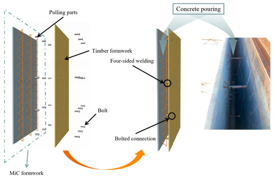 We propose a thin and lightweight permanent formwork with a thickness of only 30 mm, which is called MiC formwork. Its construction is similar to precast concrete laminated panels. Tie bolts are welded at the truss reinforcement nodes of MiC formworks. When used as an outer shear wall formwork, it is bolted to the outer timber formwork. When used as an inner shear wall formwork, the bolts are passed through the opposite wall plate and fixed to form a shear wall by pouring concrete (Figure 1). From the structural engineering point of view, the formwork should be designed for different ultimate loads and applicable loads, including the lateral pressure of filling materials. Due to the thinness of the MiC formwork, the lateral pressure exerted on the slab by the concrete pouring will lead to mold rise, cracking, and slurry leakage. Adding fibers to concrete is a good solution for its stress cracking. Steel fibers, as a commonly used fiber addition, can significantly improve the tensile strength, toughness, and cracking resistance of the concrete matrix [25,26]. Therefore, three groups of commonly used MiC formworks with different material component types are designed for static loading tests. We establish a refined numerical model based on the established specifications and carry out parametric analysis of important parameters, such as the concrete strength class and the fiber content of the steel fiber concrete. The aim is to find the MiC formwork with the best working performance and to provide a theoretical reference for its application in practical engineering.