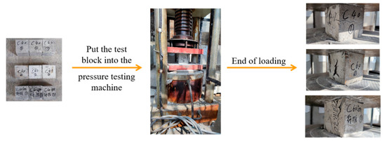 Three types of concrete were used in the test: ordinary C40 concrete, ordinary C60 concrete, and C60 steel fiber concrete. C60 steel fiber concrete contains 1% steel fibers by volume, and the steel fibers are 0.5 mm in diameter and 15–30 mm in length. Each grade of concrete has three standard specimen samples of 150 mm × 150 mm × 150 mm. The compressive strength of concrete was measured after 28 days of curing (Figure 2). The results were multiplied by a conversion factor of 0.95, as shown in Table 1. The compressive strengths of the C40 concrete, C60 concrete, and C60 steel fiber concrete were 41.42 MPa, 60.99 MPa, and 62.35 MPa, respectively. These were the average values of three identical tests conducted on each material. The measured compressive strengths of these three types of concrete all meet the specification requirements.
