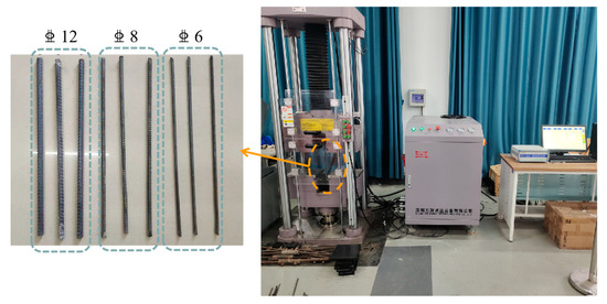 The grades of reinforcement bars used in the test formworks were all HRB400 with diameters of 12 mm, 8 mm, and 6 mm, respectively. Three groups of rebars with different diameters and all with a length of 50 mm were used, with 3 samples from each set. Figure 3 demonstrates the testing process for the yield strength and ultimate tensile strength of the steel bars. The measured mechanical properties of the reinforcement bars are shown in Table 2, and all of them met the specification requirements.