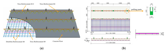 Figure 4 shows the construction of the MiC formworks. Internal threaded cylindrical pins were soldered at the truss reinforcement of the specimen as a tie member, and its row density increased with the increase in the lateral pressure on the formwork. The concrete base plate was designed as a two-way plate, and the specific parameters are shown in Table 3. The thickness of the protective layer of the base plate was 10 mm, and the diameter of the base plate distribution bar was 6 mm. The truss reinforcement was welded by the upper and lower chord bars and the web bars, the diameters of which were 12 mm, 8 mm, and 6 mm, respectively.