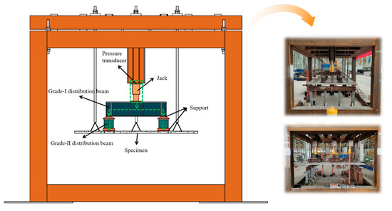 In this test, a new type of loading steel frame was designed to meet the special stressing mode of MiC formworks, consisting of the main steel frame and the top channel steel combination beam. The specimen loading device is shown in Figure 5. The specimen was fixed to the loading device using rigid spacers suspended from the threaded rod. A hydraulic jack was used to apply the load to the distribution beam. The load was finally transferred to the four supports through the two-stage distribution beam to simulate the uniform load.