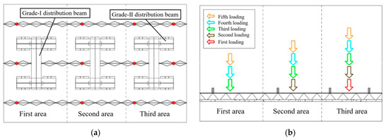 The stress surface of the specimen was divided into three regions. As shown in Figure 7, the load was first applied to the third region and then incrementally to the second and first regions. When all regions were fully loaded, the full-area loading was carried out. The designed graded load value was 10 kN, loaded by region, and the loading time was 2~3 min. Each level of loading finished after holding the load for 3~5 min. The loading ended when the specimen was damaged or had the characteristics of damage precursors.