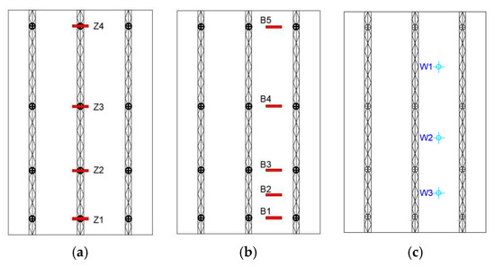 Measuring point arrangement. (a) Z1~Z4; (b) B1~B5; (c) W1~W3.