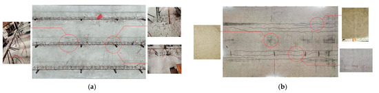 Specimen N40 was a C40 concrete formwork. During the second stage of loading, cracks (11.13 kN) started to develop at the front and back of the third area. As the load increased, the crack width gradually increased and extended. In the third stage of loading, the cracks developed vertically up to half of the slab thickness on the front side and two-thirds of the slab thickness on the back side. The specimen entered the plastic damage stage. In the process of the fourth stage of loading, the surface concrete was crushed, and the truss bars were pulled out. At the end of loading (74.45 kN), the maximum crack width at the front side was 3.2 mm, and that of the back side was 1.1 mm. The N40 specimen’s loading damage pattern and crack distribution are shown in Figure 10.