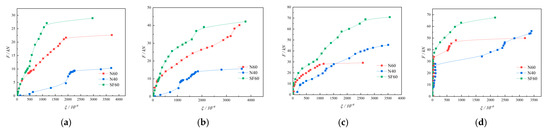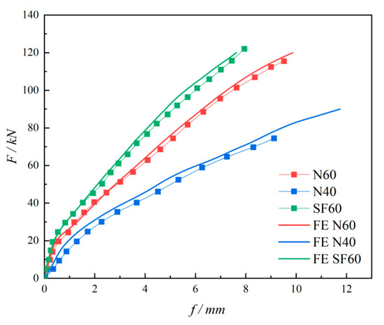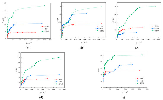 Figure 14 shows the load–deflection curves of each specimen. It can be seen that the specimens underwent two stages, elastic deformation and plastic deformation. The slopes of each deflection curve were N40, N60, and SF60 in order from small to large. The slopes of N60 and FM60 were similar. This means that the stiffness of each specimen was SF60, N60, and N40 in order from weak to strong.