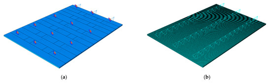 Without considering the effect of slip between the reinforcement and concrete, the reinforcement and concrete were “embedded” restrained. In the model, the location of the ties was set to “fully fixed”. The model used the pressure control method for the loading process and was consistent with the test loading system (graded zonal loading). The established models are shown in Figure 15.