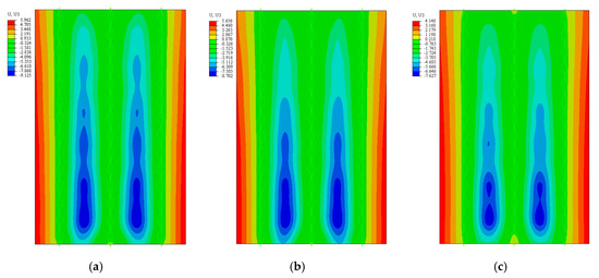 According to the damage clouds of the concrete front and back of each specimen at the peak load of the finite element analysis (Figure 18 and Figure 19), it is clear that three main cracks were produced on the concrete front, mainly distributed at the intersection of the truss tendons and the concrete. On the back side, two main cracks were produced, mainly in the middle of adjacent joist tendons. The cracks all ran along the span direction of the slab, consistent with the cracks generated by the test.
