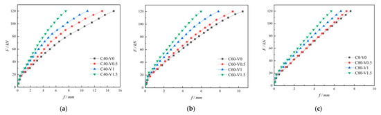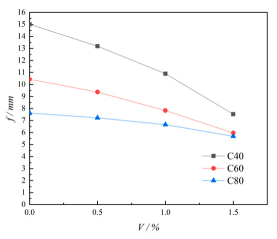 Holding the concrete strength grade constant, the stresses of the MiC formworks with different fiber volume fractions were simulated under five levels of loading, separately. The load–deflection curves are shown in Figure 20. Combined with Figure 21, the maximum deflection gradually decreased with the increase in the steel fiber volume fraction under the same strength group, and the decrease gradually increased. This indicates that the stiffness of the MiC formwork increases with the amount of steel fiber admixture when the volume fraction of steel fiber is not more than 1.5%. As the strength grade of the concrete matrix increased, the effect of increasing the volume fraction of steel fibers on the reduction in the model maximum deflection decreased. This indicates that when the strength grade of the concrete matrix is high, the shear strength of the steel fiber-reinforced concrete increases more slowly as the steel fiber content increases.