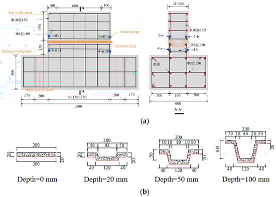 Reinforcement configuration and geometric dimensions of the specimens (mm): (a) details of the prefabricated concrete wall panels; (b) details of the keyway.