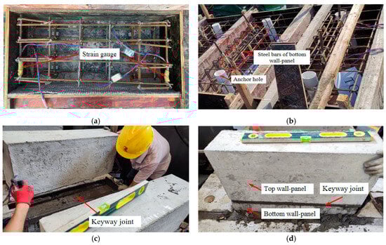 Figure 3 shows the manufacturing and assembly procedure for the prefabricated concrete wall panels. The prefabricated concrete wall panels were divided into two parts for casting. In this case, the bottom load-bearing base and the bottom wall panel were cast together as one unit, while the top wall panel was cast separately. During the process of manufacturing the prefabricated components, steel reinforcement cages were placed into the molds, followed by the direct pouring of the concrete, as shown in Figure 3a,b. After fabricating all the prefabricated concrete components, they were cured at room temperature for 28 days. Subsequently, the assembly process began; the mortar was first poured at the keyway, and the assembly of the top and bottom wall panels was mainly reliant on the self-weight of the top wall panel for a tight and reliable connection, as shown in Figure 3c,d.