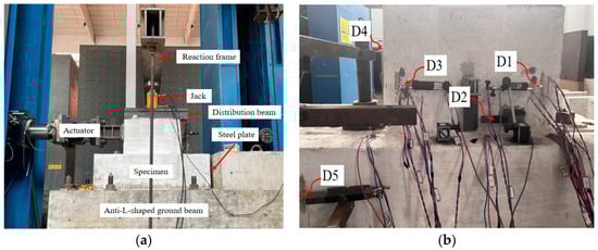 The testing procedure for each specimen was conducted using a versatile structural testing system, as illustrated in Figure 4. The prefabricated concrete wall panel was securely anchored to the anti-L-shaped ground beam with high-strength bolts, and an additional steel plate was added on the right side to prevent any slippage of the bottom load-bearing base. Horizontal loads were applied by the left-side actuator. Meanwhile, vertical loads were applied through the reaction frame and hydraulic jacks, ensuring even distribution across the top surface of the wall panel by employing a distribution beam. It is crucial to maintain a constant axial load during tests. As a result, a force transducer, positioned between the reaction frame and the jack, monitored the axial force, as shown in Figure 4a. Furthermore, in order to further investigate the impact of keyway depth on the mechanical properties of longitudinal reinforcing bars located at the corners of the prefabricated concrete wall panel, strain gauges were symmetrically attached to the steel bars of both the top and bottom wall panels (Figure 2a). Figure 4b depicts the measurement of interface slippage for keyway joints, where a total of five displacement meters (labelled D1–D5) were arranged. In this case, D1, D2, and D3 were employed to measure the horizontal interface slippage. The calculation of slip involves taking the average of D1 and D3, and then comparing them with D2 to obtain their average value. In addition, D4 and D5 were used to monitor whether there was a corner for the prefabricated wall panels and the slippage of the base, respectively. D1, D2, and D3 were employed to measure the horizontal interface slippage.