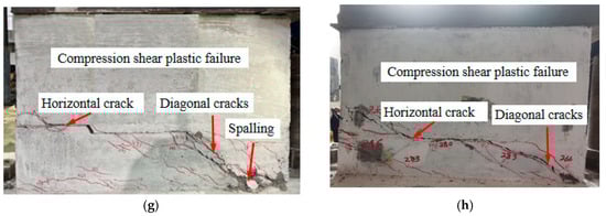 During monotonic horizontal loading, all keyway joints experienced cracking, subsequent crack propagation, and interface sliding stages. Figure 5 illustrates the failure modes and crack distributions in the keyway joints. It can be observed that the failure modes of all keyway joints exhibit consistent properties. They all manifest with initial cracking propagating along the keyway joint, and some of these cracks diagonally extend downward in the bottom wall panels. Eventually, pronounced sliding and localized concrete crushing were evident in the bottom wall panels.