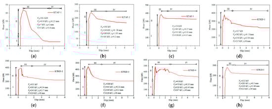 Shear–slip curves of the test specimens: (a) KTAF-1; (b) KTAF-2; (c) KTAF-3; (d) KTKD-1; (e) KTKD-2; (f) KTKD-3; (g) KTKD-4; (h) KTKD-5.