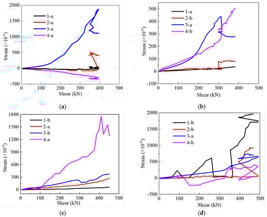 The shear–strain envelope curves of longitudinal steel bars for specimens KTKD-1 to KTKD-4 under monotonic loads are depicted in Figure 7, and the layout of strain gauges is shown in Figure 2. In specimen KTKD-1, the variation in steel bar strain was relatively low, primarily remaining within the elastic stage (Figure 7a). This can be attributed to the straight joint connection between the top and bottom wall panels. Under monotonic loading, the wall panel experienced shear brittle failure along the straight joint, resulting in limited plastic deformation, thus keeping the steel bar primarily within the elastic range. In contrast, the steel bar strain values in specimens KTKD-2, KTKD-3, and KTKD-4 were significantly greater than those in KTKD-1, as shown in Figure 7b–d. This difference can be attributed to the enhanced depth of the keyway joint, resulting in a distinct compressive–shear plastic failure mode in the wall panels. As a result, the steel bars experienced more substantial loading, leading to a noticeable increase in the steel bar strain values.