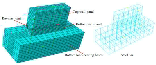 The finite element analysis model of prefabricated concrete wall panels with keyway joints was developed using ABAQUS 6.14 software, incorporating both C3D8R three-dimensional solid elements and T3D2 truss elements to represent concrete and steel bars, as shown in Figure 8. Structured meshing techniques in ABAQUS were applied to create the mesh, ensuring that grid nodes were shared at the joint interfaces. Consequently, the mesh size for the keyway was chosen to be 30 mm, whereas the mesh dimensions for the concrete and steel bars were 80 mm.