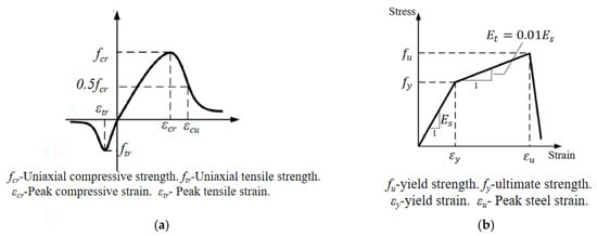 The concrete material was simulated using the concrete damage plastic model, which followed the stress–strain constitutive relationship for concrete as specified in the “Code for the Design of Concrete Structures” []; the stress–strain curve is shown in Figure 9a. The concrete damage plastic model accounts for material nonlinearity, stiffness degradation, and the influence of the strain rate on material properties. This model is integrated with fracture energy considerations to guarantee results that are not dependent on the mesh size. For more details, see [,,,]. In addition, the elastic modulus, Poisson’s ratio, and the density of the concrete were 3 × 104 N/mm2, 0.2 and 2.4 × 103 kg/m3, respectively.