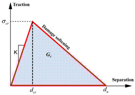 The interface model in this study employed traction–separation behavior within ABAQUS to describe the relationship between interface stress and relative displacement. This behavior was characterized using a bilinear model, representing both the linear elastic ascending segment and the damage softening segment as straight lines, as shown in Figure 10. To comply with the requirements for setting parameters related to face-to-face contact adhesive behavior in ABAQUS, certain values needed to be provided, including the contact adhesive stiffness (Knn, (ss, tt)), the maximum initial stress (σnn, (ss, tt)), and the fracture energy (Gc). To simplify the calculations and ensure result convergence, the maximum initial stress and stiffness were set to be the same for both the normal and tangential directions. However, the normal direction was configured to soften more rapidly, with the fracture energy in the normal direction being one-tenth of that in the tangential direction. The maximum initial stress was determined as the tensile strength of the material, using the smaller value between the mortar and concrete. The stiffness and fracture energy were calculated using Formulas (1) and (2). For the elastic phase, the maximum displacement (dcr) was set to 0.3 mm based on experimental data, while the ultimate displacement (du) was set to 6 mm. The values for the contact interface parameters are provided in Table 3.