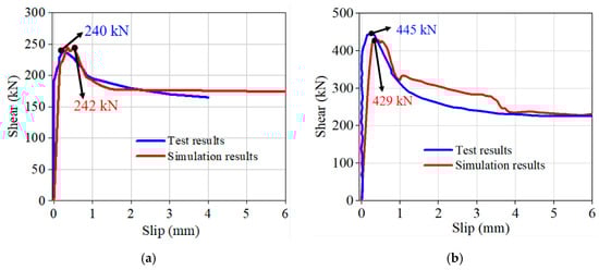 Shear–slip curves of the simulation and experimental results: (a) KTAF-2; (b) KTKD-3.