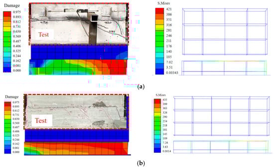 It is evident from KTAF-2 and KTKD-3 that significant concrete damage occurred primarily at the keyway joint and the ends of the bottom wall panels, which was consistent with the experimental observations (Figure 12c and Figure 13a). In Figure 12d and Figure 13b, the horizontal and longitudinal distribution of steel stress in the bottom wall panel was locally close to yielding, which is consistent with the steel strain of the experimental results. Overall, the finite element results can effectively reproduce the experimental results, verifying the accuracy of the finite element model.