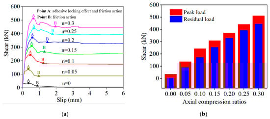 Effect of axial compression ratios: (a) shear–slip curves; (b) peak load and residual load.
