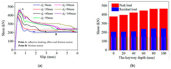 Effect of keyway depth: (a) shear–slip curves; (b) peak load and residual load.