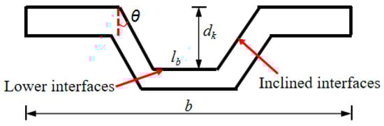 The keyway interface consists of the upper and lower interfaces and the two inclined interfaces, as shown in Figure 16. To explore the optimal range of inclination angles θ for the inclined interface, using specimen KTKD-3 as a reference (tan θ = 0.2, α = 11.3°), we examined the impact of tan θ values of 0, 0.4, and 0.6, which correspond to angles of 0°, 21.8°, and 31°, on the shear behavior of the keyway joint.