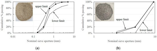 The materials used in this study include PO 42.5 cement, tap water, sea sand, and crushed stone aggregates. The cement was provided by a local company and fulfilled the requirements of the corresponding product code. Normal tap water was used as the mixing water directly [] and was used to produce man-made seawater in Section 3.5. Un-desalted sea sand was obtained from a local desalting plant. The coarse aggregates adopted were single-grade crushed stone with a nominal aggregate size of 5–10 mm. Sieve analysis was conducted on both sea sand and coarse aggregates (Figure 2). The grading curve of sea sand is shown in Figure 2a, together with the lower and upper limits of Zone III sand defined by Chinese code []. Based on the grading curve, the sea sand is classified as fine sand. For coarse aggregates (Figure 2b), about 80% of the aggregates fall in the range of 4.75 mm and 9.5 mm, while the other 20% fall in the range of 2.36 mm and 4.75 mm.