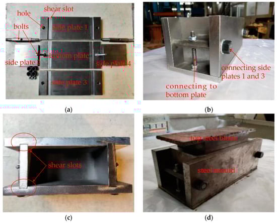 Steel mold: (a) steel plates and bolts before assembly; (b) after assembly (side view); (c) after assembly (top view); (d) installation of the top steel block.