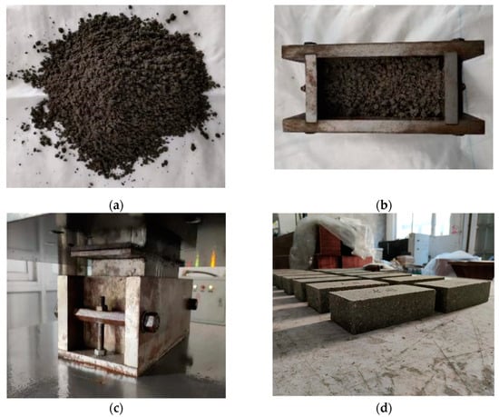The paver blocks were fabricated according to following procedure (Figure 4): (1) Concrete mixing: the sand, aggregates were mixed for one minute, then the cement was added and mixed for another minute, finally the water was added and mixed for three minutes. The concrete mixture is very dry as shown in Figure 4a. (2) Casting: about 2.7 kg concrete mixture was filled in a mould and flattened manually (Figure 4b), followed by the installation of top steel block; (3) the mold together with top steel block was placed at the center of a hydraulic loading machine (Figure 4c). The load was increased from 0 to 400 kN (20 MPa) in one minute. The load was then removed after a time duration of 1 min. (4) de-moulding and curing: the side plates of the mould was removed immediately and the blocks were kept static on the bottom plate for 24 h and then transferred to a standard curing room (20 ± 2 °C, ≥95% relative humidity) until testing (Figure 4d).