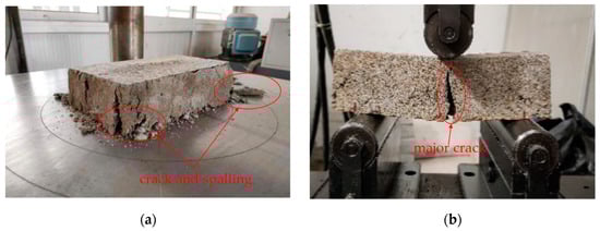 The flexure tensile tests were conducted by a 300-kN material testing machine. Before testing, the block was mounted on a jig with a span length of 150 mm, as shown in Figure 5b. A constant loading rate of 0.04 MPa/s (or 64 N/s) [] was then applied until the block ruptured. The flexural tensile strength was then calculated by the following equation []: