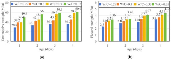 Effect of W/C ratio on mechanical strengths: (a) compressive strength; (b) flexural tensile strength.