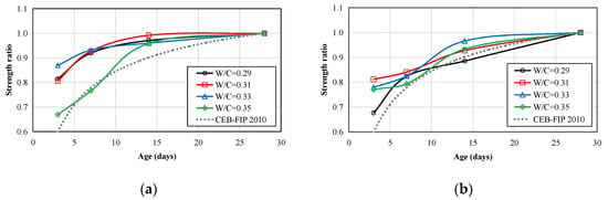 The compressive strength (fc) and flexural tensile strength (frup) of each single paver block at different ages are listed in Table 2, and the average strengths at different ages are plotted in Figure 7. It can be seen that both compressive strength and flexural tensile strength generally increase with an increase in the W/C ratio at all ages (Figure 7). When the W/C ratio was increased from 0.29 to 0.35, the average 28-day compressive strength of the blocks increased by 70.6% (35.7 MPa vs. 60.9 MPa), while the average 28-day flexural tensile strength increased by 28.2% (3.40 MPa vs. 4.36 MPa). However, for plastic concrete, it is well accepted that concrete strength generally decreases with an increase in the W/C ratio. The reason for the disagreement is believed to be that with an increase in the W/C ratio, the concrete is easier to compact, and denser concrete generally leads to an increase in strength. Based on the experience in the massive production of paver blocks in the first author’s plant, if the W/C ratio is too high, the block may not keep its shape when the mold is immediately removed after forming, as is conducted in the massive production of paver blocks. This will affect the accuracy of the final products. Also, a very large W/C ratio may also lead to a larger shrinkage of blocks during curing. As a result, a W/C ratio of 0.35 was adopted in the following parts of this study, although the strengths may further increase beyond this W/C ratio.