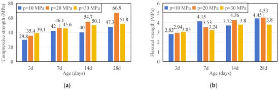 The compressive strength (fc) and flexural tensile strength (frup) of paver blocks with different forming pressures are shown in Table 3. To better understand the effect of forming pressure, the average strengths at different ages are plotted in Figure 9.