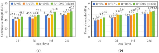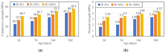 Strength development with time: (a) compressive strength; (b) flexural tensile strength.