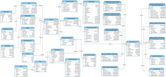 The building is used as the monitoring object, including ID, name, location, and remarks, and several sensors are installed in each monitoring object. The sensors include the sensor ID number, the monitoring object ID number, the installation location, the installation time, the sampling period, the two-level warning thresholds, and remarks. Each sensor has a designated monitoring data entity for storing specific monitoring values collected by the sensor; for example, LIDAR acquisition data contain the acquisition time, 3D point cloud data, color information, and reflection intensity. A sensor can trigger multiple warning events, which should record the time of occurrence, the sensor number, the trigger level, the trigger monitoring value, and the processing work. At the same time, associate each monitoring object with a BIM model; the essential attributes of the BIM model include the model ID, name, creation time, last update time, and the path to the model file; the BIM model is dynamically associated with the monitoring objects and sensors that are able to be added, modified, or deleted with changes in demand. In the BIM model, the location and status of the sensors need to be represented, such as sensor installation location, online status, last sampling time, and latest readings, and each BIM model also has the corresponding component-related data and other format data. Finally, each monitoring object is associated with a set of typical defect documents that categorize typical defects and provide corresponding data for each categorized typical defect.