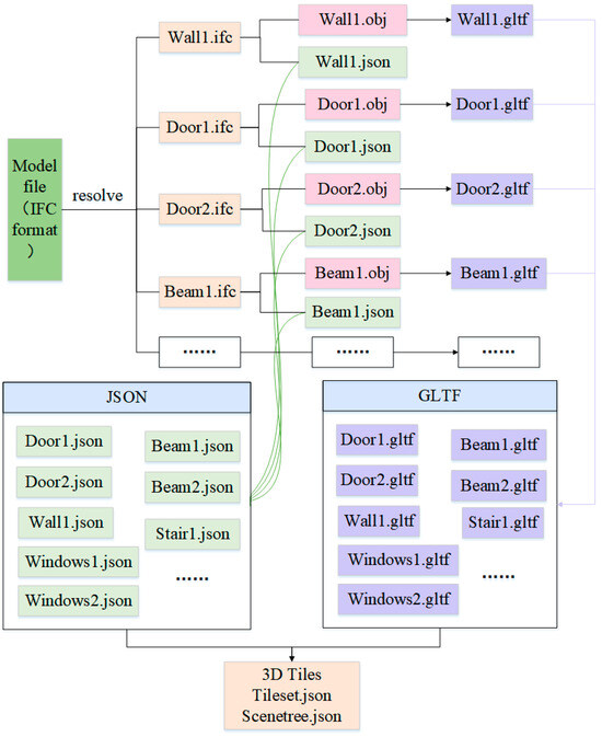 However, BIM models usually have some missing geometric data and attribute information in the data mapping conversion process. In order to realize the non-destructive access of the BIM model into the building monitoring system, this paper proposes a tile organization method based on the BIM model. For the IFC standard model data, based on the hierarchical splitting strategy of component instances of the IFC structural tree, the original IFC files are separated and reconstructed according to the component classification standard of buildings; the reconstructed IFC model files are converted to the glTF format files whose data structure fits the WebGL rendering mechanism, and the dual mapping of geometric space and semantic attributes is accomplished in the process of conversion. It solves the problems of poor model semantic integrity and weak data interoperability in the current integration scheme of IFC standard files and the WebGL framework. At the same time, the converted BIM model, in tile format, is stored in the spatial database, which is convenient for users to call and further analyze in the monitoring system. The BIM model conversion process is shown in Figure 3.