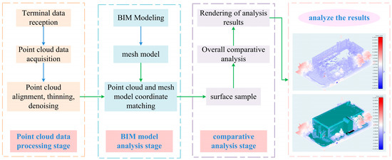 3D analysis of the combination of BIM and point cloud data is used to compare the differences between the actual state of the building and the design model. This analysis can reveal changes in building form and help users better understand and manage building projects. The process of 3D analysis with the BIM model and point cloud data is shown in Figure 6.