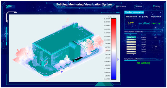 First, we process the collected point cloud through alignment, thinning, and denoising while transforming the BIM model into a mesh model. Since BIM models and point cloud data usually use different coordinate systems, we use professional BIM and point cloud processing tools to unify the coordinate system. Then, the point cloud data and mesh model are surface sampled to obtain their surface information. After completing the surface sampling of the data, the distance from each point in the point cloud to the nearest mesh surface is calculated. The point cloud is assigned a color based on the distance deviation so that the user can better understand the difference between the point cloud data and the mesh model. Finally, the 3D analysis results are rendered to the building monitoring visualization system. The results of the 3D analysis are shown in Figure 7.
