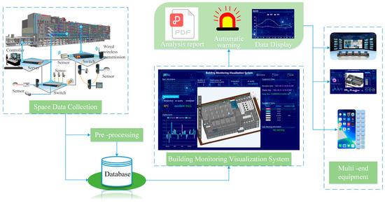 According to the monitoring plan, the sensors are installed at various key locations in the building. The frequency of data collection is set according to the monitoring objectives and the need for data analysis to collect various data from the building’s interior and the surrounding environment, such as temperature and humidity, light, noise, and 3D point cloud data. Each sensor is associated with the corresponding location in the BIM model at the time of installation so that the status and data of the sensor can be subsequently displayed in the model. The collected data is transmitted to the server and stored in the object-relational space database via wire networks and wired connections; the collected data are also corrected, converted, and processed to ensure the accuracy of the data. The analyzed data are presented to the user as charts and reports. The overall flow of monitoring is shown in Figure 10.