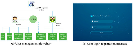 User management mainly involves user registration, login, permission management, and other links. In the user registration and login session, after receiving the login information, the platform will query the administrator’s information table to determine whether the username and corresponding password are correct. If the information is detected correctly, the user can log in to the system and access the privileges assigned by the system administrator; privilege management is one of the core links of user management. The identities of users are divided into administrators and common users. Administrators’ rights include adding, deleting, modifying the information of the data, maintaining the system, and reviewing the application items of common users. The rights of common users include browsing, querying, outputting, printing the information of the land data, and applying to the administrator for adding data or files. Figure 11 shows the user management flow chart and login and registration interface.