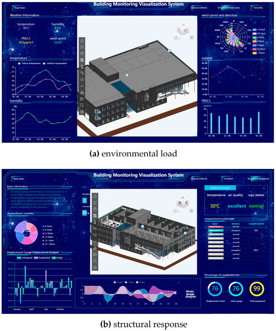 In addition, by visualizing the correlation, distribution, and trend of data from various sensors (e.g., temperature, humidity, light, and noise sensors), the distribution of data can be observed intuitively, and abnormal values that do not conform to the usual pattern can be identified, which is conducive to the detection of malfunction and the early warning and handling of abnormal events of the monitoring system and helps to detect potential problems and take corresponding measures at an early stage. Environmental loads and structural response data management and visualization are shown in Figure 12.