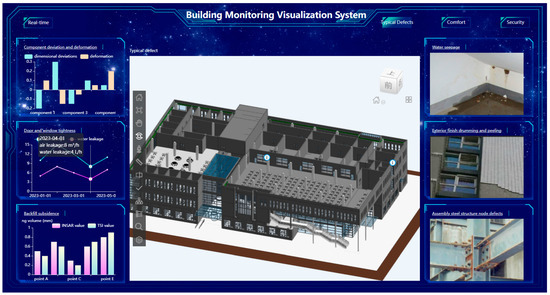 Building monitoring systems enable highly interactive and visual monitoring data management by tightly integrating BIM (Building et al.) models and sensor technology. This integration allows users to understand the monitoring systems within a building and access monitoring data in real time. The association of BIM models and sensors extends the BIM model from being a tool for the design and construction phase to the operation and management phases of the building, making the BIM model a “real-time” model. The primary method is to select suitable mounting locations for the sensors based on the monitoring targets and building conditions. At the same time, we put anchor points on the selected sensor mounting locations on the BIM model. These anchor points mark the exact location of the sensors on the model. In this way, we can ensure that the sensors’ physical location is the same as the intended location in our BIM model. Then, through the designed data acquisition program, we control the sensors to collect the data and acquire the real-time data from the sensors through the backend technology, which is stored in the database, and, at the same time, sent to the frontend, which, after receiving the data, visualizes the monitoring data in real-time in the form of charts and graphs at the anchor points. That is, through the BIM model’s component direct connection function, the component and the sensor position are linked, and the sensor monitoring data are directly associated with the corresponding elements in the model. The monitoring data and the BIM model are fused to become the carrier of the data, realizing the digital twin of the engineering physical world and the virtual world.