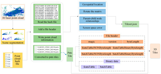 In response to realizing the efficient visualization of massive point cloud to point cloud to construct a 3D Tiles tile structure with a multi-detail level, the scene file is segmented into a multi-detail level hash file by an octree segmentation algorithm, the hash file is transformed into point tile data format, and the geospatial location, rotation matrix, geometric error, and other information of the tile data are generated into index files according to the octree spatial data structure. Finally, the 3D Tiles structure is generated. The process of constructing 3D Tiles from point cloud data is shown in Figure 14.