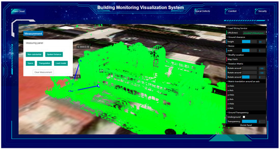 The system supports effective management and organization of point cloud data. Through frontend and backend technologies, the stored point cloud data are called from the spatial database and displayed in 3D with the help of efficient visualization; the system supports the color mapping function of the point cloud, which displays the point cloud with different attributes or features in different colors to help users understand the point cloud data more intuitively. Meanwhile, the system provides various operation functions to enable users to flexibly process and analyze the point cloud data, such as rotating, scaling, and moving the point cloud to observe the 3D structure and details of the building. In addition, the system supports measurements and annotations on the laser point cloud. Users can select specific points, lines, or surfaces in the point cloud for measurement to obtain accurate measurement results such as distance, angle, or surface area, which promotes the application and development of the laser point cloud technology in BIM; users can also annotate the point cloud to record important information or problems of the building for subsequent reference and processing. The point cloud data management function is shown in Figure 15.