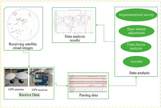 The GPS monitoring module is mainly designed for deformation monitoring of buildings, utilizing GPS technology’s high precision and all-weather measurement characteristics to observe and analyze the horizontal displacement of buildings comprehensively. The GPS receiver acquires satellite signals and records the measurement data. The raw GPS data are analyzed and decoded to obtain information such as satellite position, time stamp, and signal strength and stored in the spatial database. Then the data leveling processing is carried out according to the receiver coordinates, mainly by comparing the measurement data of the reference station and the mobile receiver, calculating the difference between the two, and applying the difference to the measurement data of the mobile receiver. The leveling processing can eliminate the error and noise, and correct the measurement data, to obtain a more accurate positioning result. In addition to the essential positioning and leveling processing, the GPS monitoring module can perform time series and wavelet analyses to remove noise and roughness and retain the actual displacement. The GPS data processing flow is shown in Figure 16.