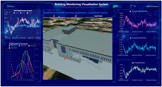 Based on the spatial database for building comfort and structural safety monitoring, GPS data are integrated with the BIM model to achieve visualization and analysis of the realized data. Marking GPS data points in the BIM model enables visual observation of the exact location and layout of the building in the real world, and comparing the displacement in the GPS data with the original location in the BIM model enables intuitive observation of the changes in the structure of the building and the displacement, and at the same time provides the GPS data visualization function, which enables the user to better understand and make use of the GPS data and discover the patterns and trends as well as potential anomalies and abnormal events so that corresponding measures can be taken on time. The GPS data analysis and visualization interface are shown in Figure 17.